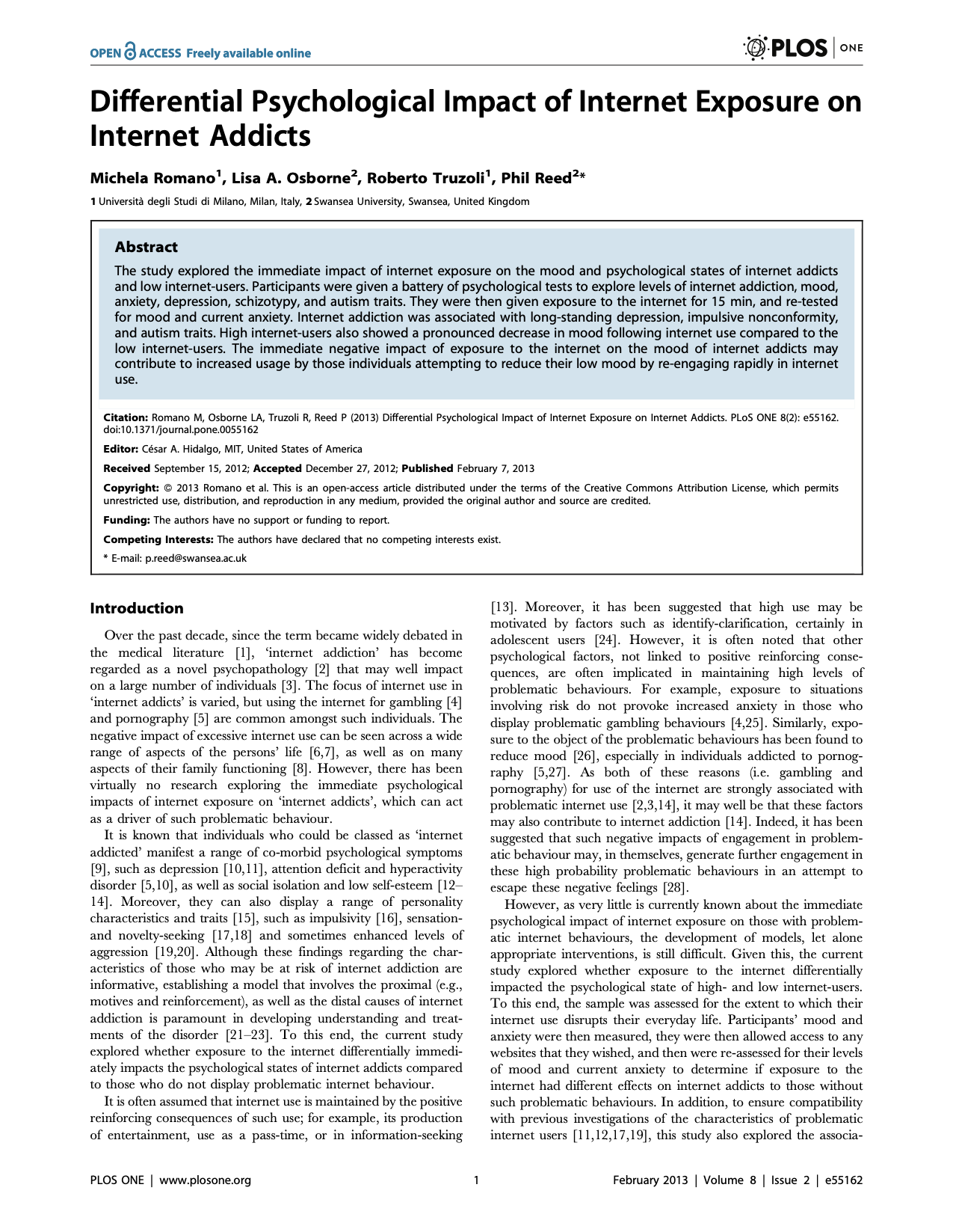 Romano, M., Osborne, L. A., Truzoli, R., & Reed, P. (2013). Differential psychological impact of internet exposure on Internet addicts. PloS One, 8(2), e55162. https://doi.org/10.1371/journal.pone.0055162