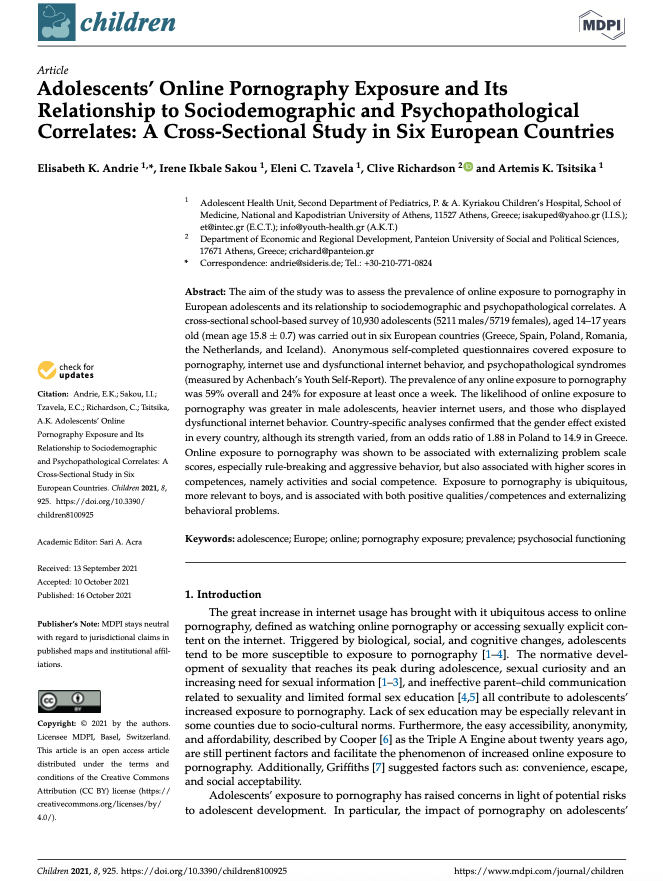 Andrie, E. K., Sakou, I. I., Tzavela, E. C., Richardson, C., & Tsitsika, A. K. (2021). Adolescents’ Online Pornography Exposure and Its Relationship to Sociodemographic and Psychopathological Correlates: A Cross-Sectional Study in Six European Countries. Children, 8(10), Article 925. https://doi.org/10.3390/children8100925
