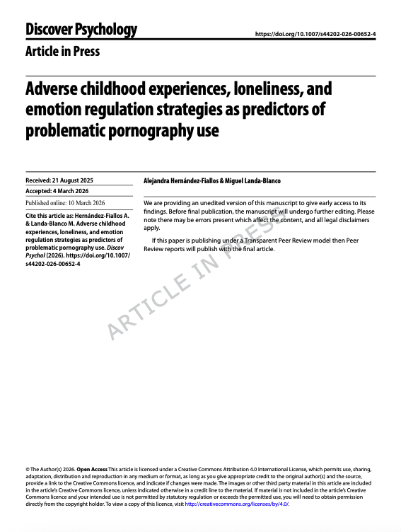 Hernández-Fiallos, A., & Landa-Blanco, M. (2026). Adverse childhood experiences, loneliness, and emotion regulation strategies as predictors of problematic pornography use. Discover Psychology. https://doi.org/10.1007/s44202-026-00652-4