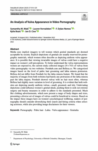 Maki, S. M., Vernaleken, L., Nemes, F. D., Bozic, K., & Cioe, J. D. (2025). An Analysis of Vulva Appearance in Video Pornography. Sexuality & Culture, 27, 310-325. https://doi.org/10.1007/s12119-022-10014-6