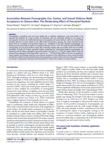 Zhang, X., Fu, T., Yang, J., Li, R., Liu, X., & Zheng, L. (2024). Association Between Pornography Use, Sexism, and Sexual Violence Myth Acceptance in Chinese Men: The Moderating Effect of Perceived Realism. Health Communication, 40(3), 372–381. https://doi.org/10.1080/10410236.2024.2346675