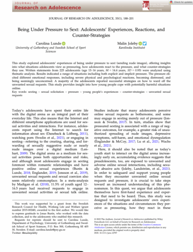 Lunde, C., & Joleby, M. (2023). Being Under Pressure to Sext: Adolescents’ Experiences, Reactions, and Counter-Strategies. Journal of research on adolescence, 33(1), 188–201. https://doi.org/10.1111/jora.12797
