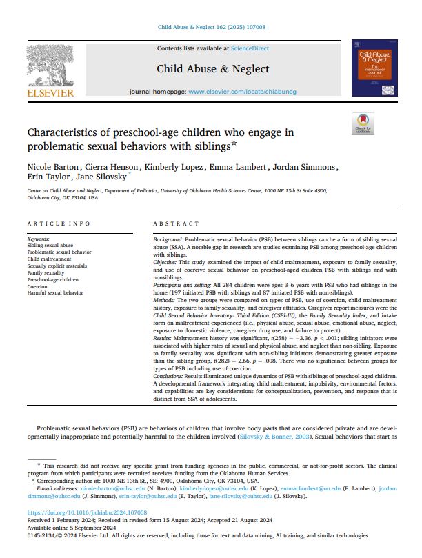Barton, N., Henson, C., Lopez, K., Lambert, E., Simmons, J., Taylor, E., & Silovsky, J. (2025). Characteristics of preschool-age children who engage in problematic sexual behaviors with siblings. Child abuse & neglect, 162, Article 107008. https://doi.org/10.1016/j.chiabu.2024.107008