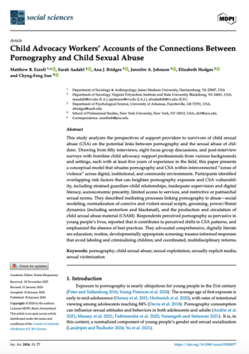 “Despite their diverse professional roles, gender identities, nationalities, regional settings, racial identities, religious beliefs, and personal views on pornography, all 50 respondents recognized a clear interconnection between pornography and CSA [childhood sexual abuse].”