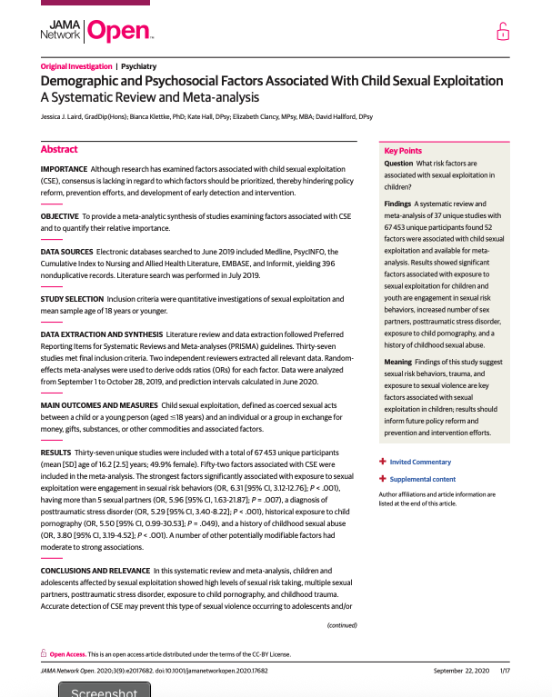 Laird, J. J., Klettke, B., Hall, K., Clancy, E., & Hallford, D. (2020). Demographic and Psychosocial Factors Associated With Child Sexual Exploitation: A Systematic Review and Meta-analysis. JAMA Network Open, 3(9), Article e2017682. https://doi.org/10.1001/jamanetworkopen.2020.17682