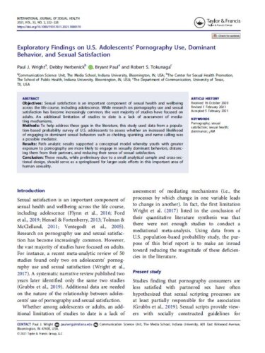 Wright, P. J., Herbenick, D., Paul, B., & Tokunaga, R. S. (2021). Exploratory Findings on U.S. Adolescents’ Pornography Use, Dominant Behavior, and Sexual Satisfaction. International journal of sexual health, 33(2), 222–228. https://doi.org/10.1080/19317611.2021.1888170