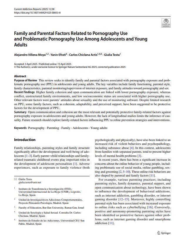 Moya, A.V., Efrati, Y., Chiclana Actis, C., & Testa, G. (2025). Family and Parental Factors Related to Pornography Use and Problematic Pornography Use Among Adolescents and Young Adults. Current Addictions Reports, 12, Article 38. https://doi.org/10.1007/s40429-025-00653-8