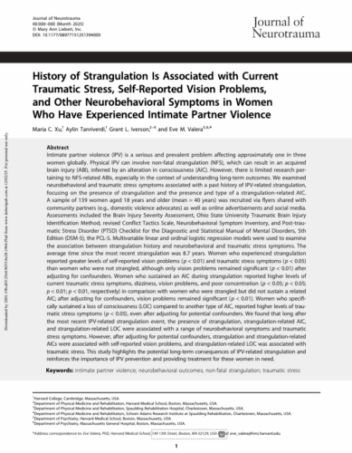 Xu, M. C., Tanriverdi, A., Iverson, G. L., & Valera, E. M. (2025). History of Strangulation Is Associated with Current Traumatic Stress, Self-Reported Vision Problems, and Other Neurobehavioral Symptoms in Women Who Have Experienced Intimate Partner Violence. Journal of Neurotrauma. https://doi.org/10.1177/08977151251394000