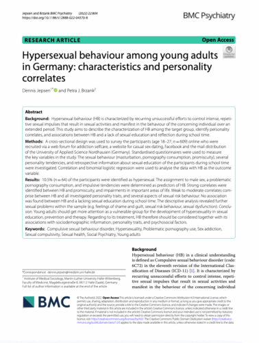 Jepsen, D., & Brzank, P. J. (2022). Hypersexual behaviour among young adults in Germany: characteristics and personality correlates. BMC psychiatry, 22(1), Article 804. https://doi.org/10.1186/s12888-022-04370-8