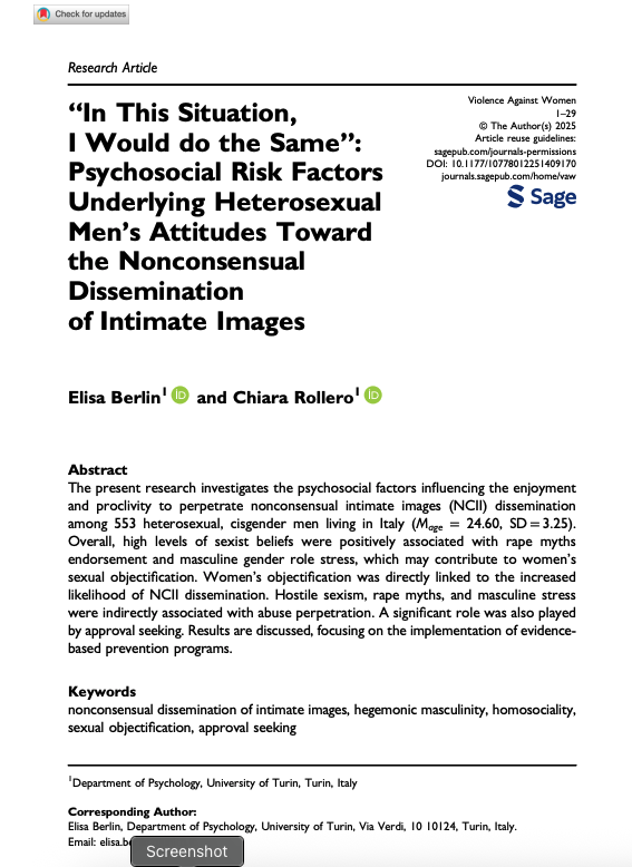 Berlin, E., & Rollero, C. (2025). “In This Situation, I Would do the Same”: Psychosocial Risk Factors Underlying Heterosexual Men’s Attitudes Toward the Nonconsensual Dissemination of Intimate Images. Violence Against Women. https://doi.org/10.1177/10778012251409170