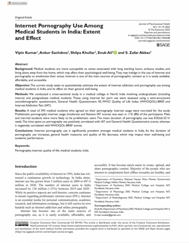 Kumar, V., Sachdeva, A., Khullar, S., Ali, e., & Abbas, S. Z. (2022). Journal of Psychosexual Health, 4(1), 14-19. https://doi.org/10.1177/26318318211065648