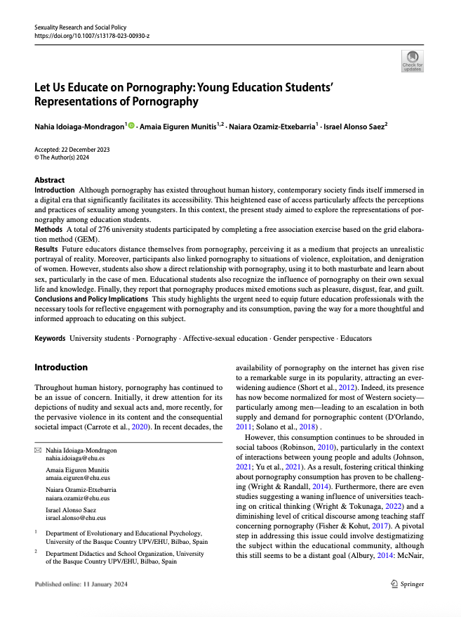 Idoiaga-Mondragon, N., Eiguren Munitis, A., Ozamiz-Etxebarria, N., & Alonso Saez, I. (2025). Let us educate on pornography: Young education students’ representations of pornography. Sexuality Research & Social Policy, 22(1), 268–278. https://doi.org/10.1007/s13178-023-00930-z