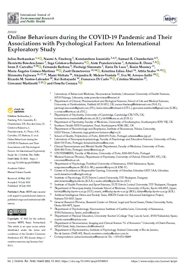 Burkauskas, J., Fineberg, N. A., Ioannidis, K., Chamberlain, S. R., Bowden-Jones, H., Griskova-Bulanova, I., Pranckeviciene, A., Dores, A. R., Carvalho, I. P., Barbosa, F., Simonato, P., De Luca, I., Mooney, R., Gómez-Martínez, M. Á., Demetrovics, Z., Ábel, K. E., Szabo, A., Fujiwara, H., Shibata, M., Melero-Ventola, A. R., … Corazza, O. (2022). Online Behaviours during the COVID-19 Pandemic and Their Associations with Psychological Factors: An International Exploratory Study. International journal of environmental research and public health, 19(14), 8823. https://doi.org/10.3390/ijerph19148823