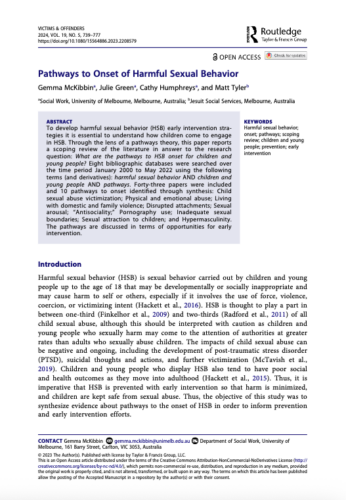 McKibbin, G., Green, J., Humphreys, C., & Tyler, M. (2024). Pathways to Onset of Harmful Sexual Behavior. Victims & Offenders, 19(5), 739–777. https://doi.org/10.1080/15564886.2023.2208579