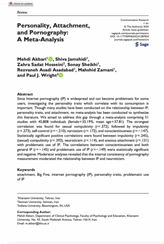 Akbari, M., Jamshidi, S., Hosseini, Z. S., Sheikhi, S., Asadi Asadabad, R., Zamani, M., & Wright, P. J. (2024). Personality, Attachment, and Pornography: A Meta-Analysis. Communication Research. https://doi.org/10.1177/00936502241287834