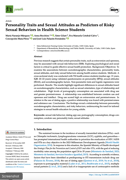 Naranjo-Márquez, M., Bocchino, A., Gilart, E., Cotobal-Calvo, E. M., Mata-Pérez, C., & Palazón-Fernández, J. L. (2026). Personality Traits and Sexual Attitudes as Predictors of Risky Sexual Behaviors in Health Science Students. Youth, 6(1), Article 19. https://doi.org/10.3390/youth6010019