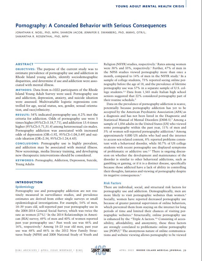 Noel, J. K., Jacob, S., Swanberg, J. E., & Rosenthal, S. R. (2023). Pornography: A Concealed Behavior with Serious Consequences. Rhode Island medical journal, 106(3), 29–34. http://www.rimed.org/rimedicaljournal/2023/04/2023-04-29-yamhc-noel.pdf