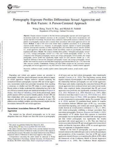 Zheng, W., Ray, T. N., & Parkhill, M. R. (2024). Pornography exposure profiles differentiate sexual aggression and its risk factors: A person-centered approach. Psychology of Violence, 14(4), 280–289. https://doi.org/10.1037/vio0000513