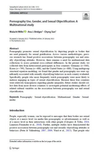 Willis, M., Bridges, A. J., & Sun, C. (2022). Pornography use, gender, and sexual objectification: A multinational study. Sexuality & Culture, 26(4), 1298–1313. https://doi.org/10.1007/s12119-022-09943-z