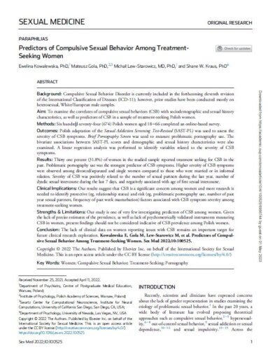 Kowalewska, E., Gola, M., Lew-Starowicz, M., & Kraus, S. W. (2022). Predictors of Compulsive Sexual Behavior Among Treatment-Seeking Women. Sexual medicine, 10(4), 100525. https://doi.org/10.1016/j.esxm.2022.100525