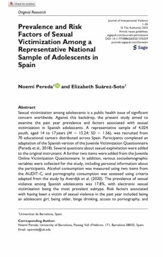 Pereda, N., & Suárez-Soto, E. (2025). Prevalence and Risk Factors of Sexual Victimization Among a Representative National Sample of Adolescents in Spain. Journal of Interpersonal Violence. https://doi.org/10.1177/08862605251376339