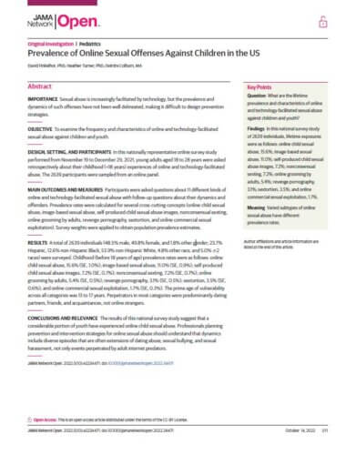 Finkelhor, D., Turner, H., & Colburn, D. (2022). Prevalence of Online Sexual Offenses Against Children in the US. JAMA network open, 5(10), e2234471. https://doi.org/10.1001/jamanetworkopen.2022.34471