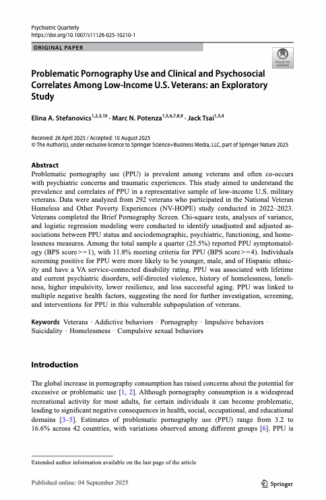 Stefanovics, E.A., Potenza, M.N. & Tsai, J. Problematic Pornography Use and Clinical and Psychosocial Correlates Among Low-Income U.S. Veterans: an Exploratory Study. Psychiatric Quarterly (2025). https://doi.org/10.1007/s11126-025-10210-1