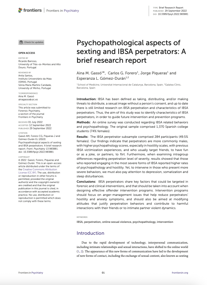 Gassó, A. M., Forero, C. G., Piqueras, J., & Gómez-Durán, E. L. (2022). Psychopathological aspects of sexting and IBSA perpetrators: A brief research report. Frontiers in psychiatry, 13, 983881. https://doi.org/10.3389/fpsyt.2022.983881