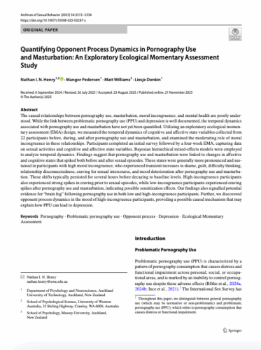 Henry, N. I. N., Pedersen, M., Williams, M., & Donkin, L. (2025). Quantifying Opponent Process Dynamics in Pornography Use and Masturbation: An Exploratory Ecological Momentary Assessment Study. Archives of sexual behavior, 54(9), 3313–3334. https://doi.org/10.1007/s10508-025-03287-z