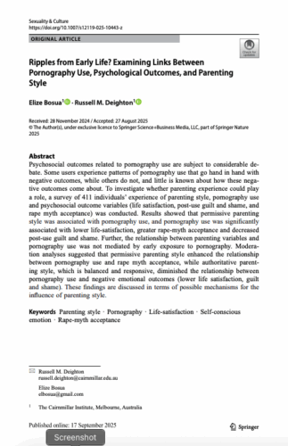 Bosua, E., & Deighton, R.M. (2025). Ripples from Early Life? Examining Links Between Pornography Use, Psychological Outcomes, and Parenting Style. Sexuality & Culture. https://doi.org/10.1007/s12119-025-10443-z