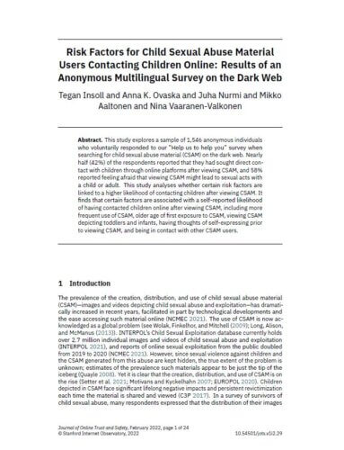 Insoll, T., Ovaska, A. K., Nurmi, J., Aaltonen, M., & Vaaranen-Valkonen, N. (2022). Risk Factors for Child Sexual Abuse Material Users Contacting Children Online: Results of an Anonymous Multilingual Survey on the Dark Web. Journal of Online Trust and Safety, 1(2). https://doi.org/10.54501/jots.v1i2.29