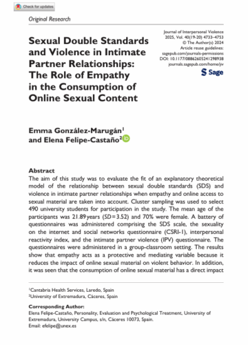 González-Marugán, E., & Felipe-Castaño, E. (2025). Sexual Double Standards and Violence in Intimate Partner Relationships: The Role of Empathy in the Consumption of Online Sexual Content. Journal of interpersonal violence, 40(19-20), 4733–4753. https://doi.org/10.1177/08862605241298938