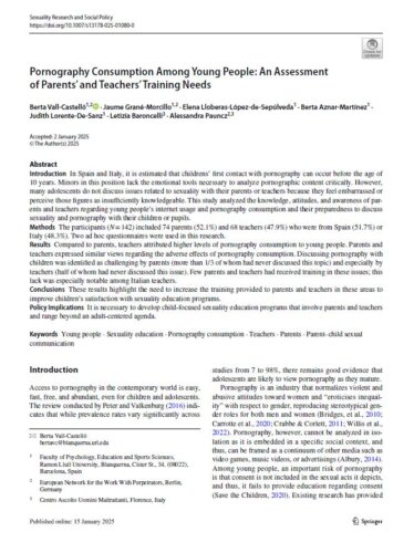 Vall-Castelló, B., Grané-Morcillo, J., Lloberas-López-de-Sepúlveda, E., Aznar‑Martínez, B., Lorente‑De‑Sanz, J., Baroncelli, L., & Pauncz, A. (20205). Pornography Consumption Among Young People: An Assessment of Parents’ and Teachers’ Training Needs. Sexuality Research and Social Policy. https://doi.org/10.1007/s13178-025-01080-0