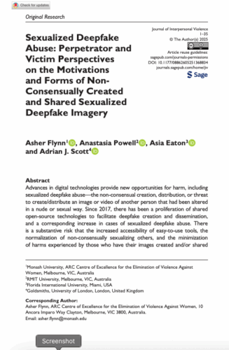 Flynn, A., Powell, A., Eaton, A., & Scott, A. J. (2025). Sexualized Deepfake Abuse: Perpetrator and Victim Perspectives on the Motivations and Forms of Non-Consensually Created and Shared Sexualized Deepfake Imagery. Journal of interpersonal violence. https://doi.org/10.1177/08862605251368834