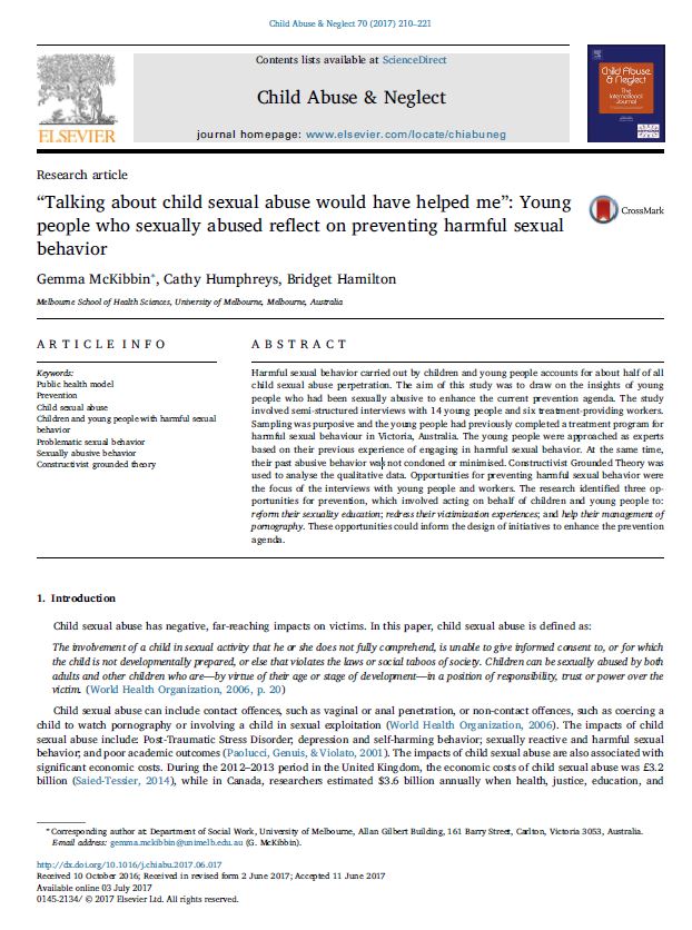 McKibbin, G., Humphreys, C., & Hamilton, B. (2017). “Talking about child sexual abuse would have helped me”: Young people who sexually abused reflect on preventing harmful sexual behavior. Child abuse & neglect, 70, 210–221. https://doi.org/10.1016/j.chiabu.2017.06.017