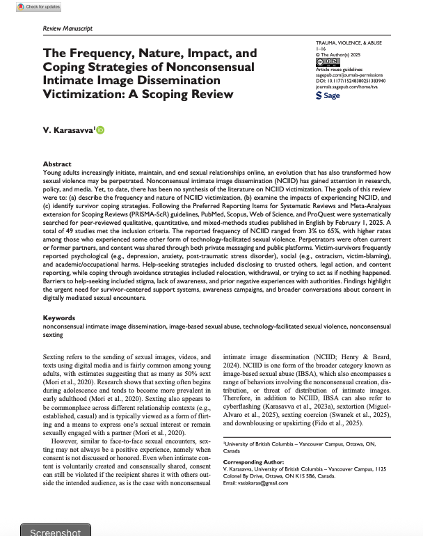 Karasavva, V. (2025). The Frequency, Nature, Impact, and Coping Strategies of Nonconsensual Intimate Image Dissemination Victimization: A Scoping Review. Trauma, Violence, & Abuse. https://doi.org/10.1177/15248380251383940
