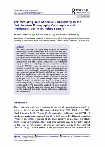 Shekarchi, R., Eleuteri, S., & Saladino, V. (2025). The Mediating Role of Sexual Compulsivity in the Link Between Pornography Consumption and Problematic Use in an Italian Sample. Sexual Health & Compulsivity. https://doi.org/10.1080/10720162.2025.2600475
