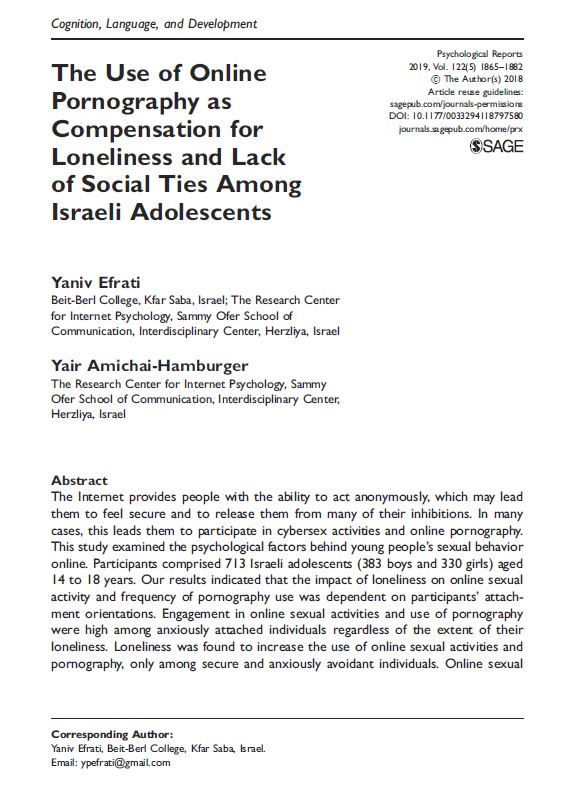 Efrati, Y., & Amichai-Hamburger, Y. (2019). The Use of Online Pornography as Compensation for Loneliness and Lack of Social Ties Among Israeli Adolescents. Psychological reports, 122(5), 1865–1882. https://doi.org/10.1177/0033294118797580