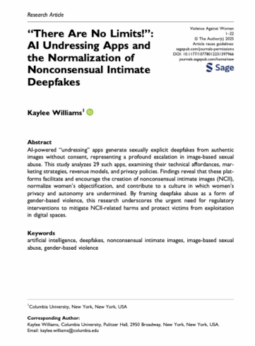 Williams K. (2025). “There Are No Limits!”: AI Undressing Apps and the Normalization of Nonconsensual Intimate Deepfakes. Violence Against Women. https://doi.org/1077/8012251397966
