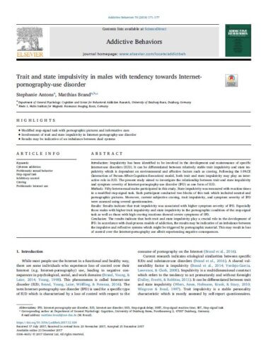 Antons, S., & Brand, M. (2018). Trait and state impulsivity in males with tendency towards Internet-pornography-use disorder. Addictive behaviors, 79, 171–177. https://doi.org/10.1016/j.addbeh.2017.12.029