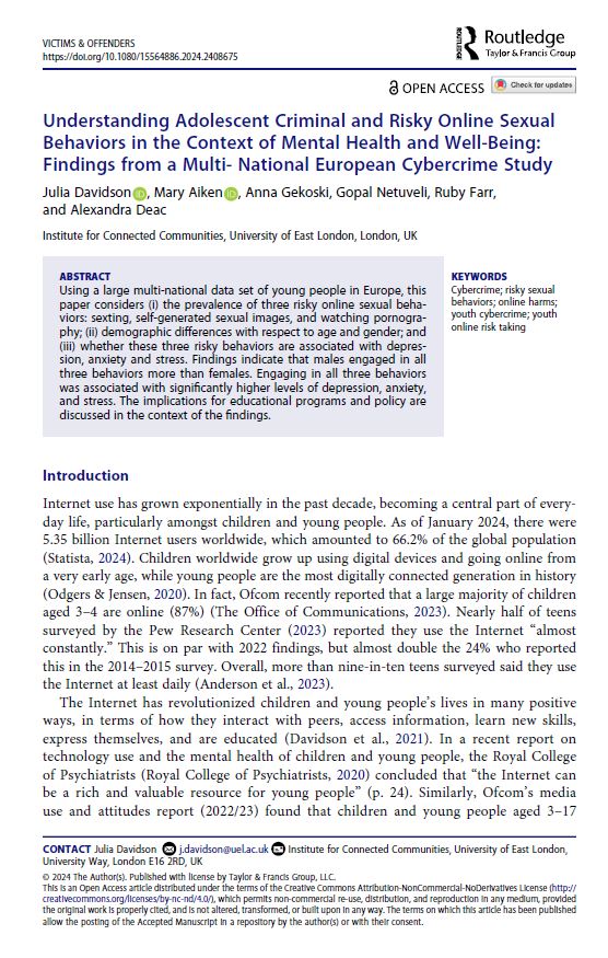 Davidson, J., Aiken, M., Gekoski, A., Netuveli, G., Farr, R., & Deac, A. (2024). Understanding adolescent criminal and risky online sexual behaviors in the context of mental health and well-being: Findings from a multi-national European cybercrime study. Victims & Offenders. https://doi.org/10.1080/15564886.2024.2408675