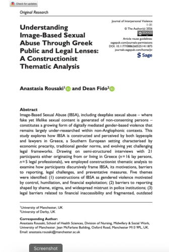 Rousaki, A., & Fido, D. (2026). Understanding Image-Based Sexual Abuse Through Greek Public and Legal Lenses: A Constructionist Thematic Analysis. Journal of Interpersonal Violence. https://doi.org/10.1177/08862605251411875