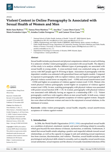 Sanz-Barbero, B., Pérez-Martínez, V., Rico, A., Otero-García, L., Fernández-López, M., Cerdán-Torregrosa, A., & Vives-Cases, C. (2025). Violent Content in Online Pornography Is Associated with Sexual Health of Women and Men. Behavioral Sciences, 15(12), 1634. https://doi.org/10.3390/bs15121634