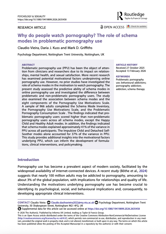 Vieira, C., Kuss, D. J., & Griffiths, M. D. (2026). Why do people watch pornography? The role of schema modes in problematic pornography use. Psychology & Sexuality. https://doi.org/10.1080/19419899.2026.2635458