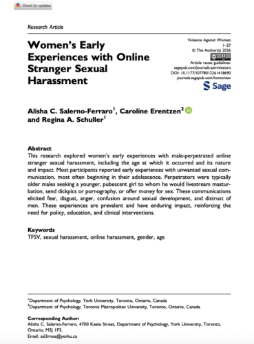 Salerno-Ferraro, A. C., Erentzen, C., & Schuller, R. A. (2026). Women’s Early Experiences with Online Stranger Sexual Harassment. Violence Against Women. https://doi.org/10.1177/10778012261418690
