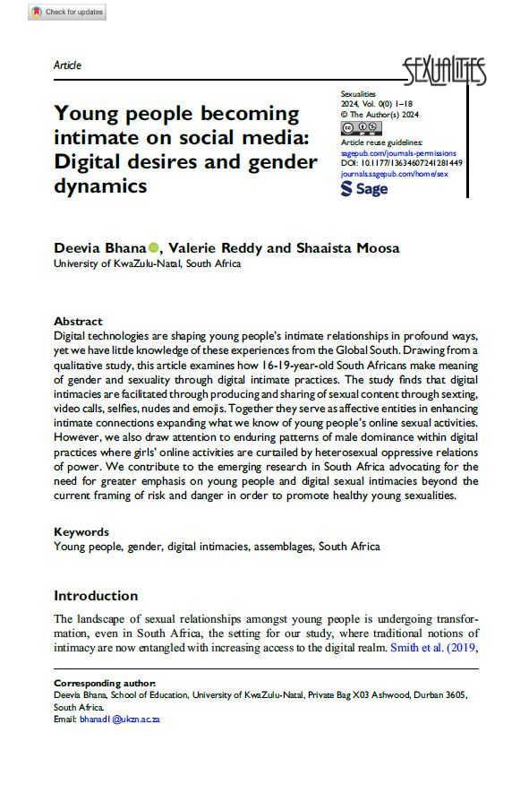 Bhana, D., Reddy, V., & Moosa, S. (2025). Young people becoming intimate on social media: Digital desires and gender dynamics. Sexualities, 28(4), 1653-1670. https://doi.org/10.1177/13634607241281449